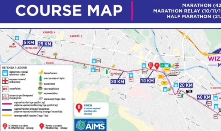 Патеката за маратонската трка, полумаратонот и штафетната трка, ќе стартува на улицата „11 Октомври“ пред Собранието и тргнува во правец кон запад по улица „Митрополит Теодосиј Гологанов“. Тркачите ќе трчаат право во двете насоки до крај на овој булевар и продолжуваат право по ул. „Васил Чакаларов“, каде по семафорите во населба Хром, ќе свртат полукружно и ќе се вратат во правец кон центар по истите улици и булевари. Кога ќе се враќаат тркачите кај Собрание, ја продолжуваат трасата по улица „11 Октомври“ кон Црвен Крст и ќе свртат кај Тутунски комбинат лево на бул. „Крушевска Република“ и десно на „Трета Македонска Бригада“. По неа ќе се трча до раскрсницата кај Американ Колеџ и ќе се врти лево по улица „Васко Карангелески“. Потоа ќе трчаат право сѐ до раскрсницата со бул. „Јане Сандански“. На раскрсницата ќе се врти десно и ќе се трча сѐ до раскрсницата со Бул. „Србија“, каде, пред неа се врти полукружно во истата коловозна страна (другата страна од булеварот е слободна за сообраќај во правец кон Центар) и ќе трчаат до пред раскрсницата кај Тобако 2. Тркачите полукружно ќе се враќаат до раскрсницата кај Сансет, ул. „Васко Карангелески“, десно до крај и повторно десно ќе излезат на „Трета Македонска Бригада“. Трчаат по истата патека до Собрание, со тоа што полумаратонците финишираат на Плоштад Македонија, а маратонците трчаат уште еден круг.