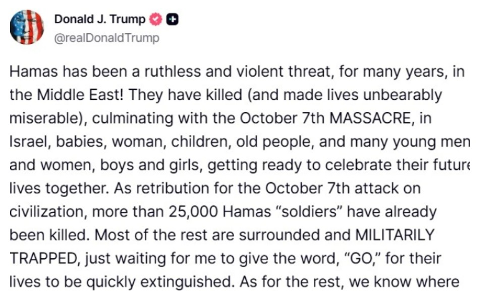 „Хамас е немилосрдна и насилна закана на Блискиот Исток со години! Тие убиваат (и го прават животот неподнослив), што кулминира со МАСАКРОТ на 7 октомври во Израел – бебиња, жени, деца, стари лица и многу млади мажи и жени, момчиња и девојчиња кои се подготвуваа да го прослават својот иден живот заедно. Како одмазда за нападот врз цивилизацијата на 7 октомври, повеќе од 25.000 „војници“ на Хамас веќе се убиени. Повеќето од другите се опкружени и воено опколени, тие само чекаат да им го кажам зборот „ОДИ“ за брзо да им се згасне животот“, наведува Трамп во својата остра објава до палестинската милитантна група.