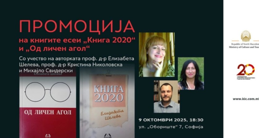Промоцијата на книгите есеи „Од личен агол“ и „Книга 2020“ на проф. д-р Елизабета Шелева ќе се одржи денеска со почеток од 18:30 часот, во Македонски културно-информативен центар во Софија.