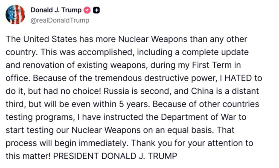 Во објава на Truth Social, Трамп денеска најави итен почеток на нови тестирања на нуклеарно оружје, оправдувајќи ја мерката со наведување на програмите за тестирање на други земји.