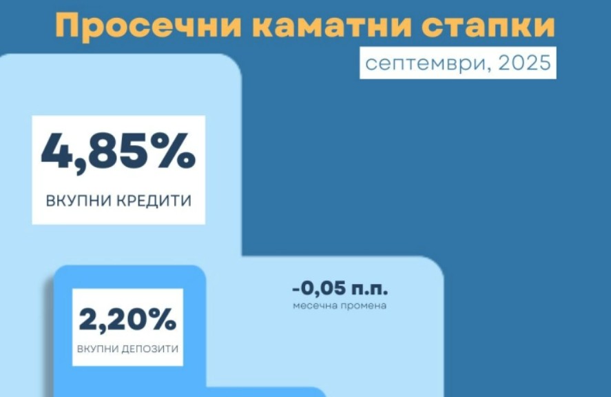 Просечната каматна стапка на вкупните кредити во септември бележи годишен пад од 0,56 процентни поени.