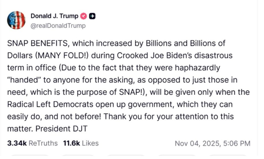 – Помошта од програмата СНАП ќе биде исплатена само кога радикално левичарските демократи ќе ја отворат владата, што лесно можат да го направат. Исплата нема да има пред тоа, објави Трамп на Truth Social.
