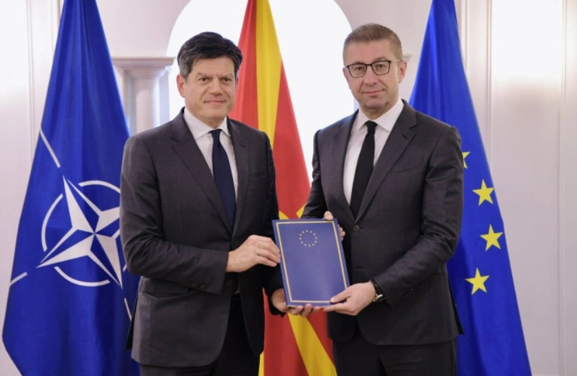 Владата останува 100 проценти усогласена со заедничката надворешна и безбедносна политика на Европската унија, што претставува важна придобивка за карактерот на нашите меѓусебни односи и за нивото на нашата посветеност кон европските вредности. Како Влада остануваме целосно посветени на европскиот пат и на реформите кои ја прават државата посилна, пофункционална и поправедна. Ќе ги адресираме сите области каде е забележан застој со конкретни мерки и отчетност. Нашата цел е полноправно членство во рамки на ЕУ – порача премиерот Христијан Мицкоски на заедничката прес-конференција со ЕУ амбасадорот Михалис Рокас по примопредавањето на Извештајот за напредокот на земјава.