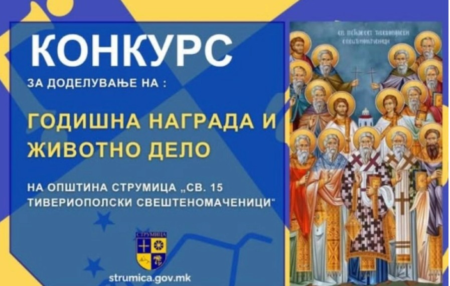 Општина Струмица го објави конкурсот за доделување на наградата „Свети петнаесет Тивериополски свештеномаченици“, која традиционално и оваа година, по повод најголемиот општински празник, ќе биде доделена како Годишна и Награда за животно дело на Општина Струмица.