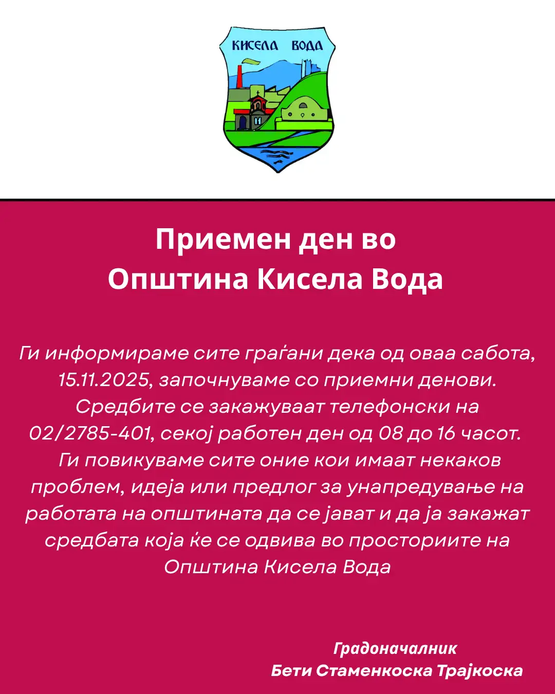 – Во насока на транспарентно и отчетно работење, како и со цел директно да се слушнат и навремено да се одговара на потребите на граѓаните, градоначалничката на Општина Кисела Вода, Бети Стаменкоска-Трајкоска, од оваа сабота започнува со приемни денови за граѓаните. На овој начин се воспоставува отворена и непосредна комуникација со жителите на Кисела Вода, која ќе придонесе за поефикасно решавање на нивните проблеми и унапредување на квалитетот на живот во општината, информираат од прес-службата на Општина Кисела Вода.