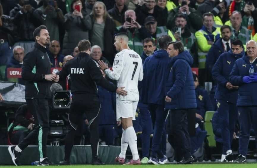 Роналдо беше исклучен откако со лакт го удри ирскиот репрезентативец Дар О’Ши во 60 минута од квалификацискиот натпревар одигран во четвртокот вечер во Даблин, во кој Ирска победи со 2:0.