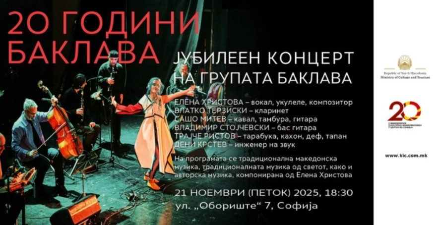 Во галеријата на Македонскиот КИЦ во Софија утре вечер од 18:30 часот, ќе се одржи јубилејниот концерт „20 години Баклава“ на групата Баклава во состав: Елена Христова (вокал, укулеле, композитор), Влатко Терзиски ( кларинет), Сашо Митев ( кавал, тамбура, гитара), Владимир Стојчевски (бас гитара), Трајче Ристов (тарабука, кахон, деф, тапан).