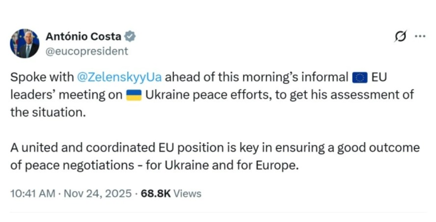 „Разговарав со претседателот Зеленски пред неформалниот состанок на лидерите на ЕУ за мировните напори во Украина, за да ја добијам неговата проценка на ситуацијата. Обединетата и координирана позиција на ЕУ е клучна за обезбедување добар исход од мировните преговори – за Украина и за Европа“, напиша Кошта на Х.