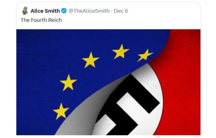 Маск реобјави коментар на еден корисник кој напиша дека ЕУ е „Четвртиот рајх“, заедно со слика на знамето на ЕУ кое се лупи за да открие знаме на нацистичка Германија со свастика под него.
