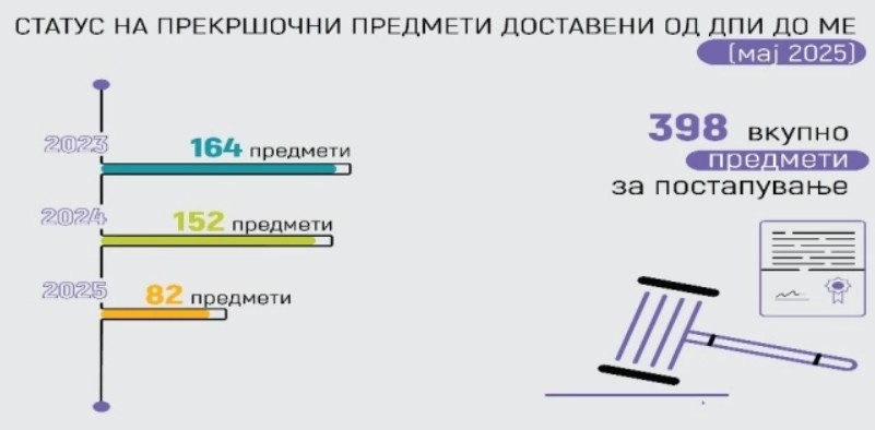 Дополнително, заклучно со мај 2025 година, од Државен пазарен инспекторат до Министерство за економија и труд се доставени 398 предмети за постапување, од кои 164 се од 2023 година, 152 од 2024 година и 82 од 2025 година.