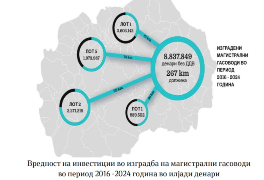 -Со ревизијата е утврдено дека најголем дел од инвестициите во тек се однесуваат на изградбата на трите магистрални гасоводи (ЛОТ 1 – 61 km, ЛОТ 1 – 36 km, ЛОТ 2 и ЛОТ 5 ). Овие инвестиции изнесуваат над 143 милиони евра без ДДВ и иако се целосно изградени во периодот од 2016 до 2024 година. Причините за ваквата состојба се нерешени имотноправни односи при експропријација на земјиштето и пролонгирања кои потекнуваат од роковите за одобрување на измени во тек на градба во минатиот период, кое во исто време влијае сѐ уште да не се ставени во употреба, се заклучува во ревизијата.