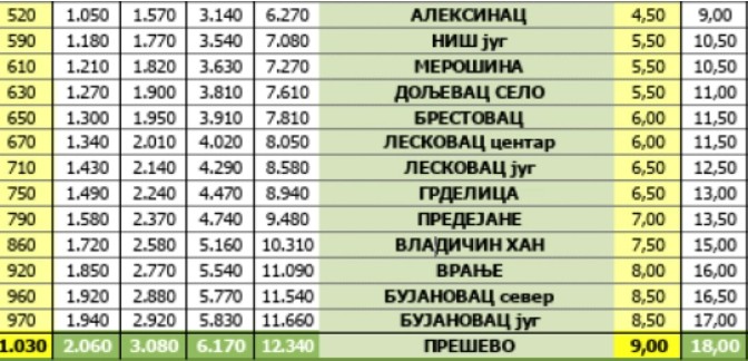 Во ценовникот со наслов „Посебна такса за користење на патарина“ е наведено дека важи од 1 јануари во 7 часот наутро. Патарината од Врање до Белград за патнички возила сега чини 1.850 динари.