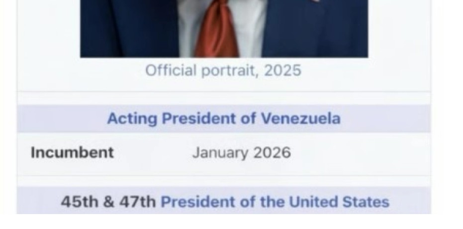 Американскиот претседател Доналд Трамп денеска на својата социјална мрежа Truth Social објави слика – симулација на неговата страница на Википедија, на која е напишано дека тој е и вршител на должноста претседател на Венецуела.