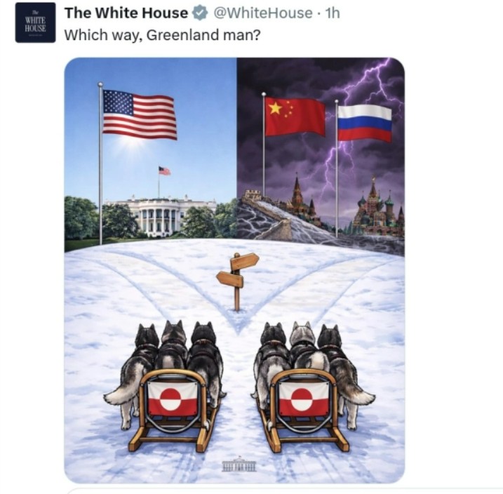 Сликата објавена на платформата X го носи насловот „На која страна, човеку од Гренланд?“ (Which way, Greenland man?) и прикажува две гренландски санки влечени од кучиња – едната насочена кон Белата куќа, а другата кон Кина и Русија. Сонцето сјае над Белата куќа, додека над Кремљ и Кинескиот ѕид беснее бура.