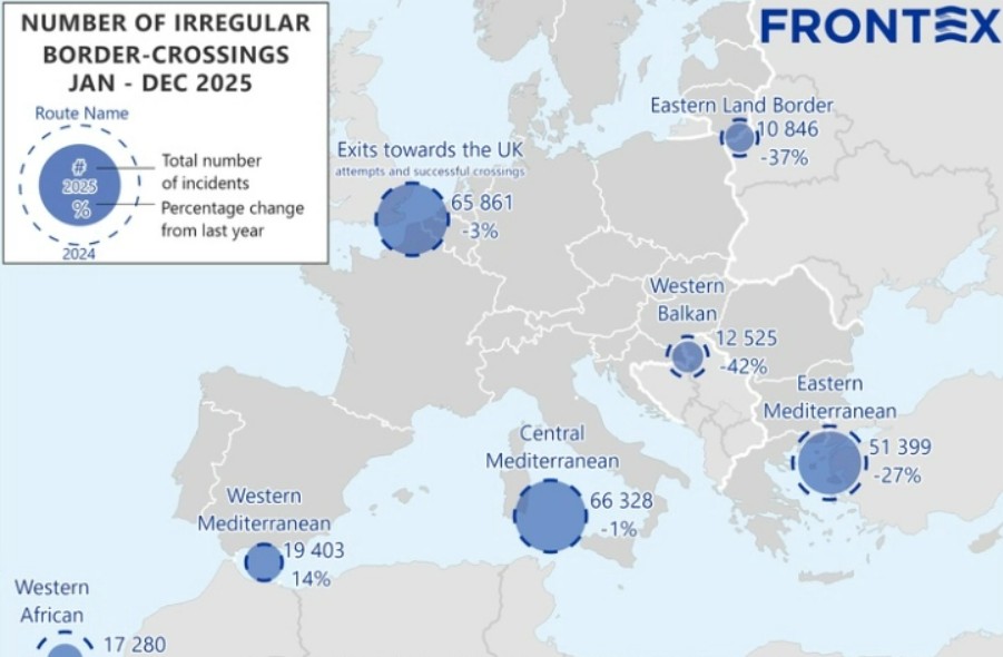 Во текот на 2025 година биле откриени речиси 178.000 илегални преминувања на надворешните граници на ЕУ, што претставува намалување за 26 отсто во споредба со претходната година, покажуваат првичните податоци на Европската агенција за гранична и крајбрежна контрола (Фронтекс) за минатата година, објавени денеска.