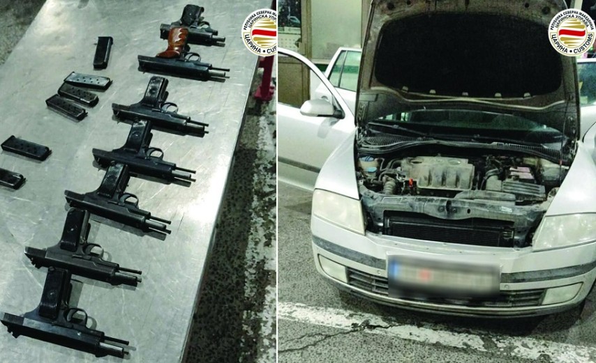 Вкупно девет службени пиштоли, украдени на 5 јануари од просториите на ЈП „Паркови и зеленило“ во Скопје, беа пронајдени во автомобил „шкода октавија“, сопственост на правно лице од Прилеп, при царинска контрола на граничниот премин „Богородица“.