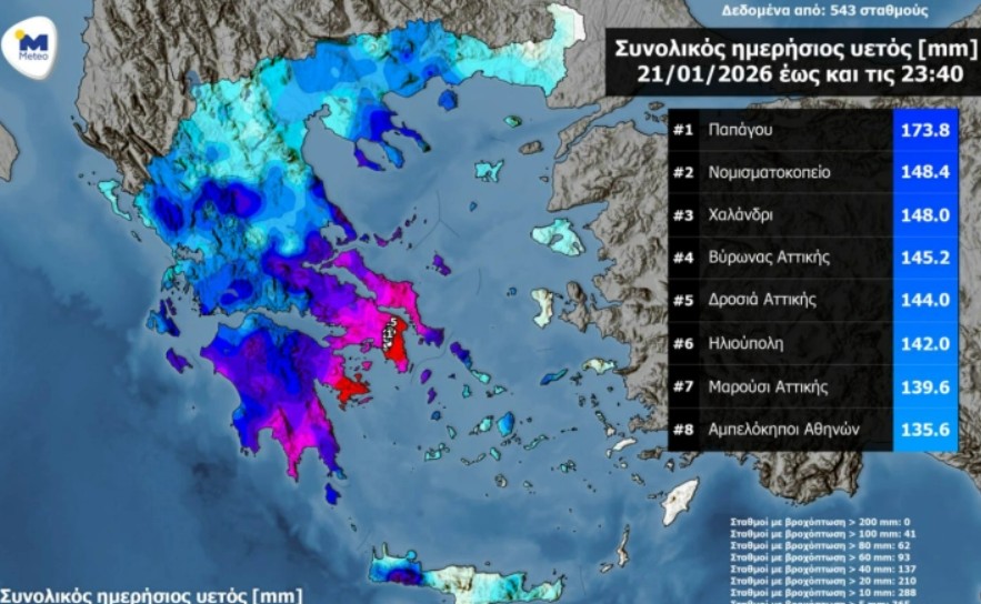 Од Националната опсерваторија на Атина и на порталот „Метео“ ги објавија податоците од 543 метеоролошки станици за вкупните количини врнежи до 23.40 часот во средата.