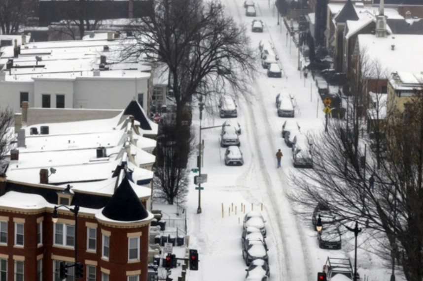 Слој снег од неколку сантиметри ги покри тротоарите и патиштата на Вашингтон, каде што беше прогласена и вонредна состојба.