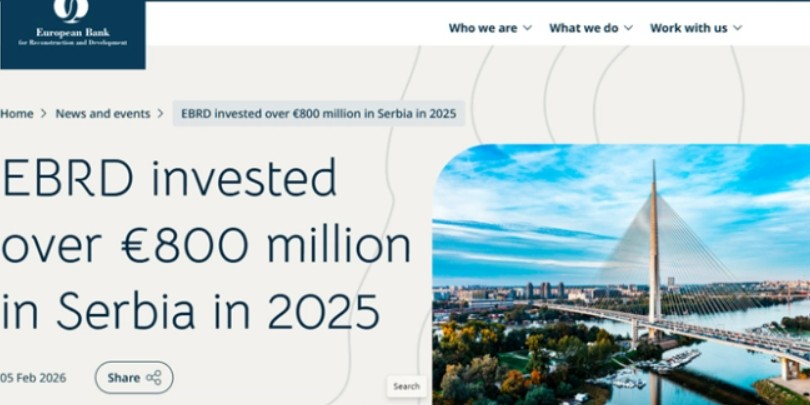 Европската инвестициска банка (ЕБОР) соопшти дека инвестирала повеќе од 800 милиони евра во разни проекти во Србија во 2025 година, во рекордни 42 проекта при што 84 отсто од вкупните инвестиции биле насочени кон приватниот сектор, со посебен фокус на зајакнување на отпорноста и конкурентноста на малите и средни претпријатија (МСП).
