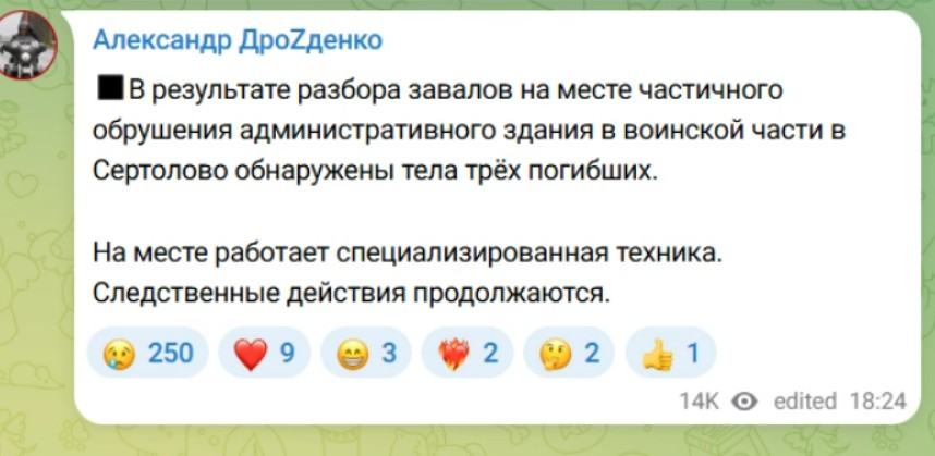 Телата биле пронајдени под урнатините на делумно уништената зграда во градот Сертолово, напиша гувернерот Александар Дрозденко на Телеграм.