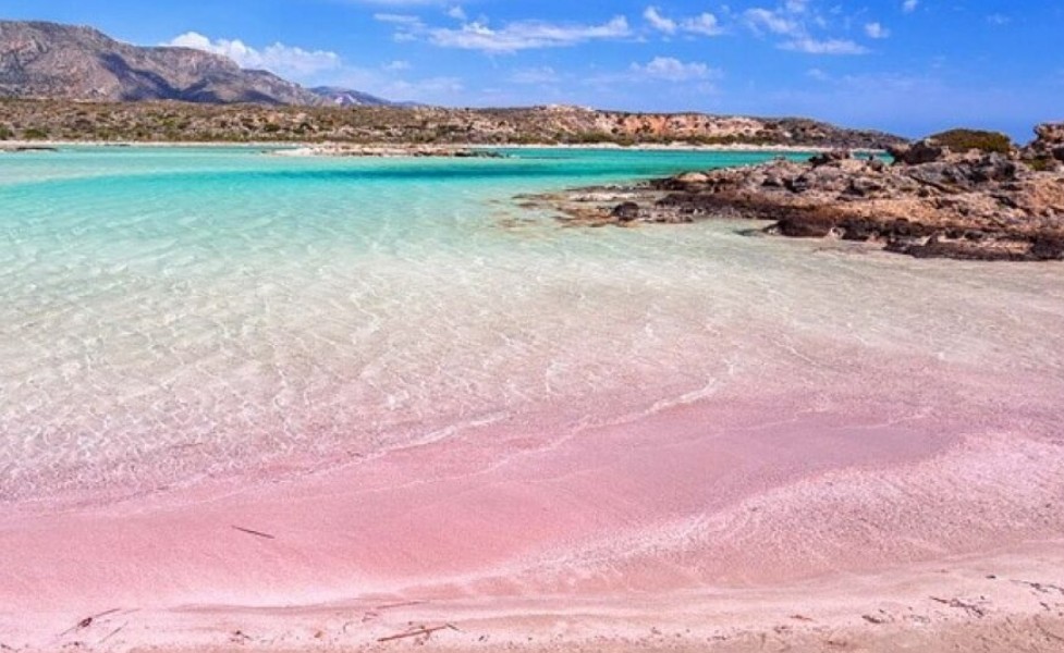 Станува збор за плажата Елафониси (Elafonissi Beach), сместена на југозападниот дел од островот Крит. Нејзиниот речиси надреален пејзаж се создава кога тиркизното море ги заплискува широките појаси од розов песок. Карактеристичната боја е резултат на ситно издробени школки и микроорганизми со црвен пигмент, донесени од коралните гребени и измешани со белиот песок под влијание на плимата.
