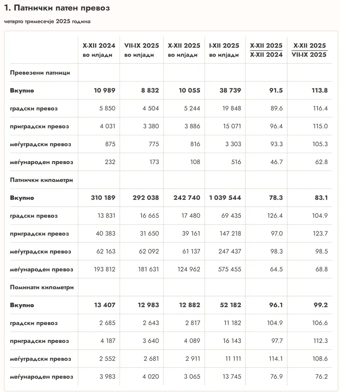 Вкупниот број на патничките километри во последниот квартал од минатата година е 242.740.000 и е намален за 21,7 проценти во однос на истиот период од претходната година. Притоа во градскиот превоз патничките километри се зголемени за 26,4 проценти, а намалени се во меѓународниот за 35,5 проценти, во приградскиот за 3 проценти, а во меѓуградскиот за 1,7 отсто.
