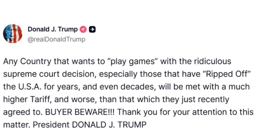 „Секоја земја што сака ’да си игра играчки‘ со апсурдната одлука на Врховниот суд, особено оние што ги ’ограбуваа‘ САД со години, па дури и децении, ќе се соочат со уште повисоки царини од оние што неодамна ги договорија. Купувачу биди на штрек“, напиша Трамп на својата социјална мрежа „Трут Соушл“.