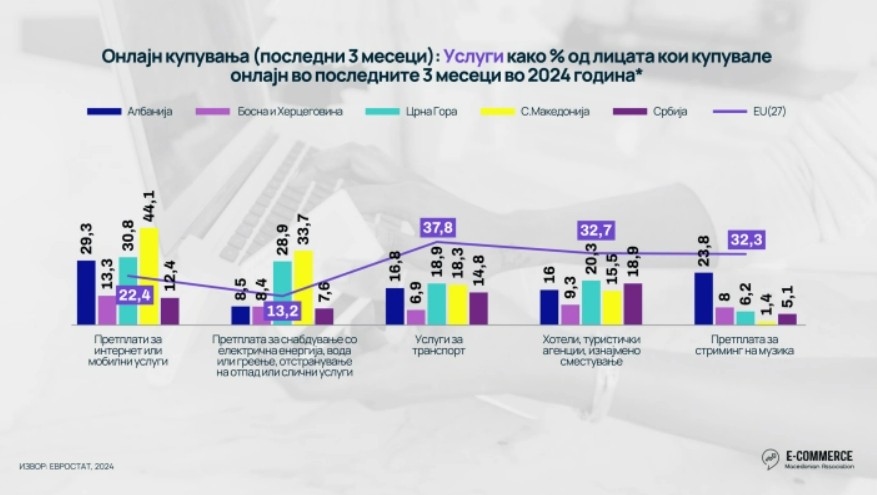 Во делот на услугите, 44,1 проценти од онлајн купувачите платиле интернет или мобилни услуги онлајн, скоро двојно повеќе од европскиот просек од 22,4 проценти. Исто така 33,7 проценти платиле комунални услуги, исто така надминувајќи го европскиот просек од 13,2 проценти, 18,3 проценти од интернет купувачите направиле букирање за транспорт, а 15,5 проценти за хотели, додека платените дигитални содржини остануваат слабо застапени, со само 1,4 проценти претплати за музички стриминг.