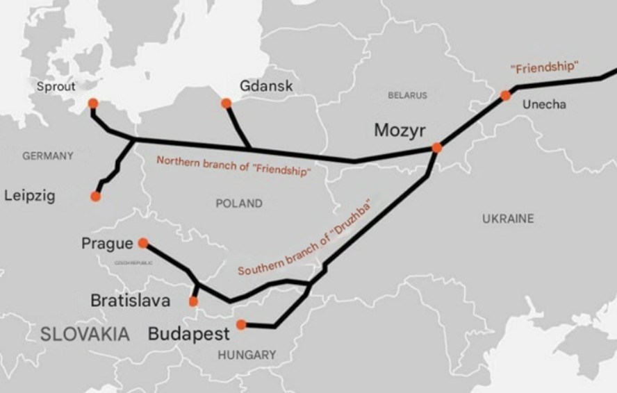 Продолжувањето на испораките беше одложено неколку пати, последниот пат до 26 февруари. Унгарија и Словачка ја обвинуваат Украина за континуираните прекини. Нафтоводот „Дружба“ започнува во рускиот град Алметјевск, поминува низ Брјанск, а потоа се разгранува и оди низ Белорусија кон Полска и Германија, и низ Украина до Унгарија, Словачка и Чешка.