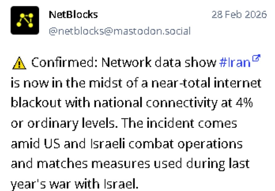 „Потврдено: Податоците од мрежата покажуваат дека интернет услугите во Иран се речиси целосно прекинати. Инцидентот се случува во време на американските и израелските воени операции и е во согласност со мерките што се користеа за време на минатогодишната војна со Израел“, соопшти групата, објави Ен-Би-Си Њуз.