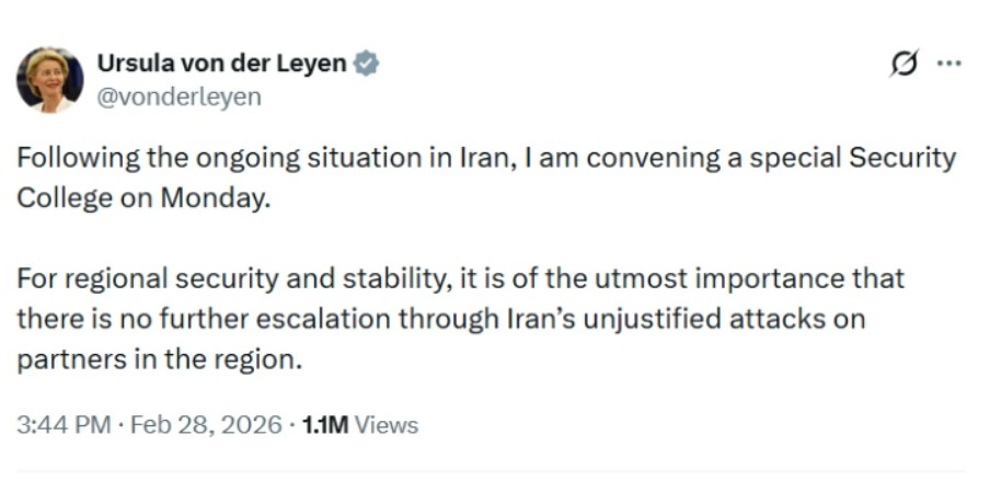 Претседателката на Европската комисија, Урсула фон дер Лајен, денеска изјави дека, поради „актуелната ситуација во Иран“, за понеделник свикува посебен состанок за безбедност.