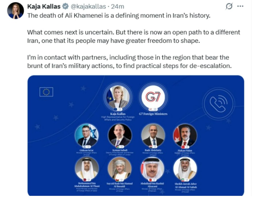 Шефицата за надворешна политика на Европската Унија, Каја Калас, изјави дека смртта на иранскиот врховен водач, ајатолахот Али Хамнеи, е „дефинирачки момент во историјата на Иран“.