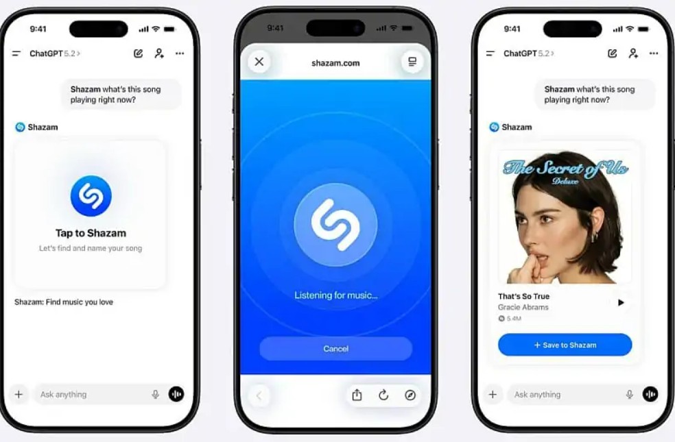 Корисниците отсега, користејќи го популарниот сервис Шазам, ќе можат да препознаваат песни директно преку ЧетГПТ, без потреба да ја напуштат апликацијата или да инсталираат дополнителни програми.