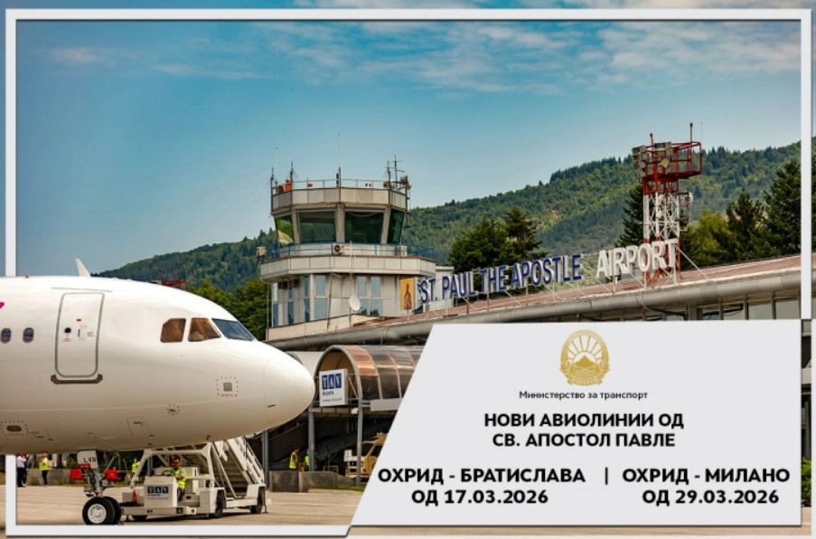 Граѓаните од денеска можат да летаат директно од аеродромот Св. Апостол Павле во Охрид до Братислава, а веќе од 29 март воведуваме уште една линија од охридскиот аеродром директно до Милано, информира вицепремиерот и министер за транспорт Александар Николоски.