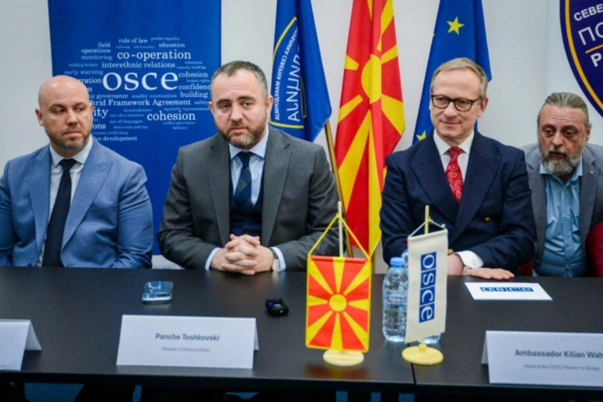 Министерот за внатрешни работи Панче Тошковски и амбасадорот на Мисијата на ОБСЕ во Скопје, Килијан Вал, денеска официјално ја пуштија во употреба целосно реновираната конференциска сала во полициската станица Бит Пазар.