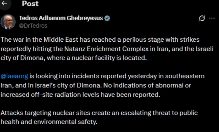 Директорот на Светската здравствена организација (СЗО), Тедрос Аданом Гебрејесус, денеска предупреди дека нападите врз нуклеарните постројки во Иран и Израел ја втурнале војната во „опасна фаза“.