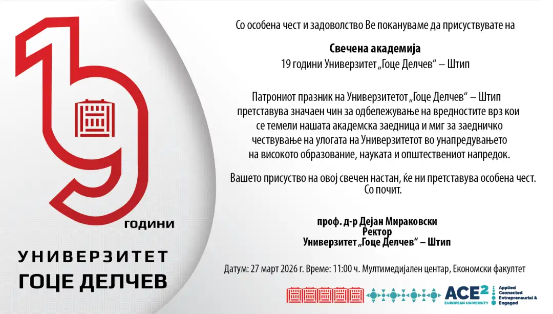 -Патрониот празник на Универзитетот „Гоце Делчев” – Штип претставува значаен чин за одбележување на вредностите врз кои се темели нашата академска заедница и миг за заедничко чествување на улогата на Универзитетот во унапредувањето на високото образование, науката и општествениот напредок. Вашето присуство на овој свечен настан, ќе ни претставува особена чест – наведува во поканата проф. д-р Дејан Мираковски, ректор Универзитет „Гоце Делчев” – Штип.