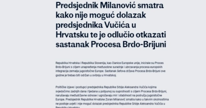 Претседателот на Хрватска и копретседател на процесот Брдо-Бриони Зоран Милановиќ денеска го откажа состанок закажан за мај на иницијативата на Бриони поради политичките изјави и постапки на претседателот на Србија, Александар Вучиќ.