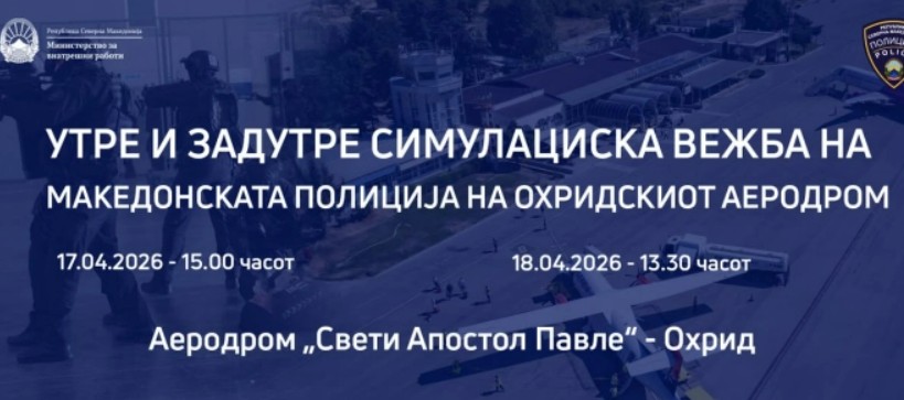 Министерството за внатрешни работи ги известува граѓаните, дека на 17.04.2026 со почеток од 15.00 часот и 18.04.2026 со почеток од 13.30 часот на меѓународниот аеродром „Свети Апостол Павле“ во Охрид ќе се одржи симулациска вежба чија цел е проверка на подготвеноста, координацијата и ефикасноста на надлежните институции во услови на кризни и вонредни ситуации.