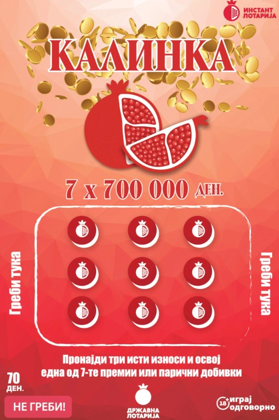 Со својата богата симболика – плодот калинка како симбол на среќа, благодат и радост е дел и од корпоративното лого на Државна лотарија. „Калинка“ е лесна и забавна игра – доволно е да се изгребат полињата за игра и да се пронајдат три исти износи, кои може да ви донесат една од 7-те главни премии по 700.000 денари или една од многубројните други парични добивки.