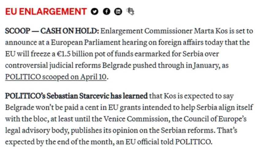 Eврокомесарката за проширување, Марта Кос, денеска ќе објави дека Европската Унија замрзнува 1,5 милијарди евра наменети за Србија поради контроверзните судски реформи усвоени од Белград во јануари – објави бриселски „Политико“.
