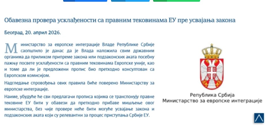 Владата на Србија денеска објави дека им наложила на сите државни органи во подготовка на закони или подзаконски акти, да посветат посебно внимание на нивна усогласеност со правните текови на Европската унија, и да проверат дека со Европската комисија претходно се направени консултации во врска со предложени прописи.
