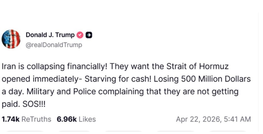„Иран финансиски колабира! Сакаат Ормуската Теснина веднаш да се отвори. Гладуваат за готовина! Губат 500 милиони долари дневно. Војската и полицијата се жалат дека не се платени“, напиша тој на „Тру соушал“.