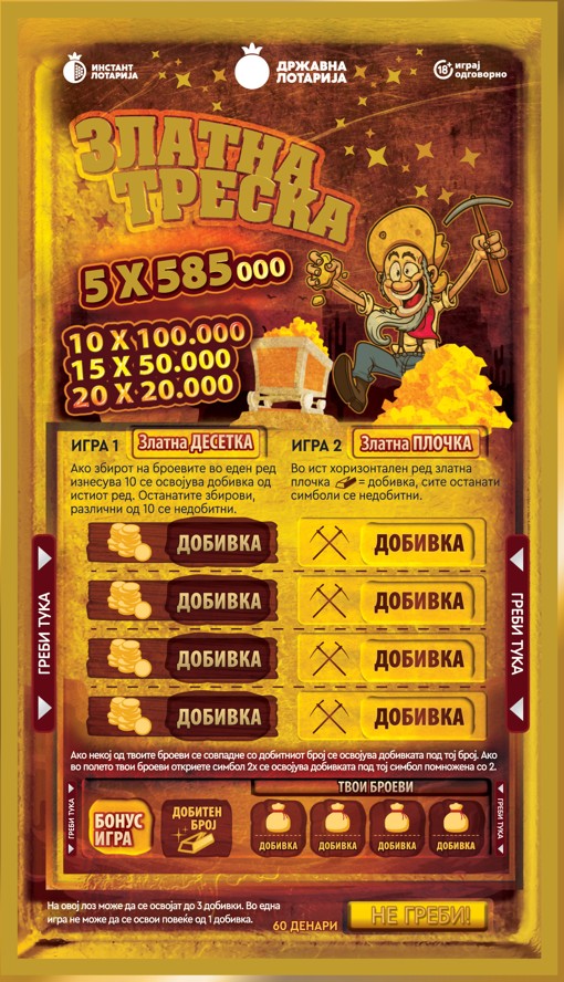 Она што ја прави „Златна треска“ посебна е можноста на еден лоз да се освојат до три добивки истовремено, што ја претвора секоја комбинација во вистинска авантура. Со цена од само 60 денари, секој лоз е шанса за нова приказна и можност да се почувствува златната треска.