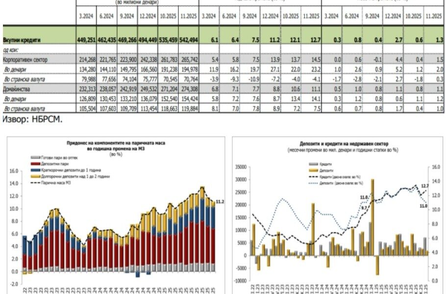Анализирано на годишно ниво, вкупните депозити во ноември годинава се повисоки за 11,0%, што во поголем дел се должи на растот на депозитите на секторот „домаќинства“,...
