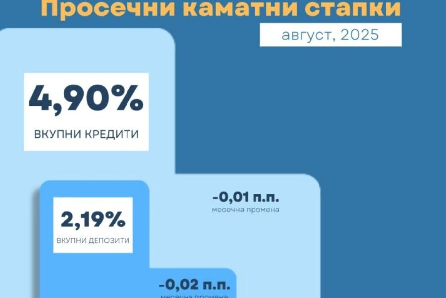 Во август годинава просечната каматна стапка на вкупните кредити изнесува 4,9 отсто и е намалена за 0,01 процентен поен (п.п.) на месечно ниво и 0,54 п.п....