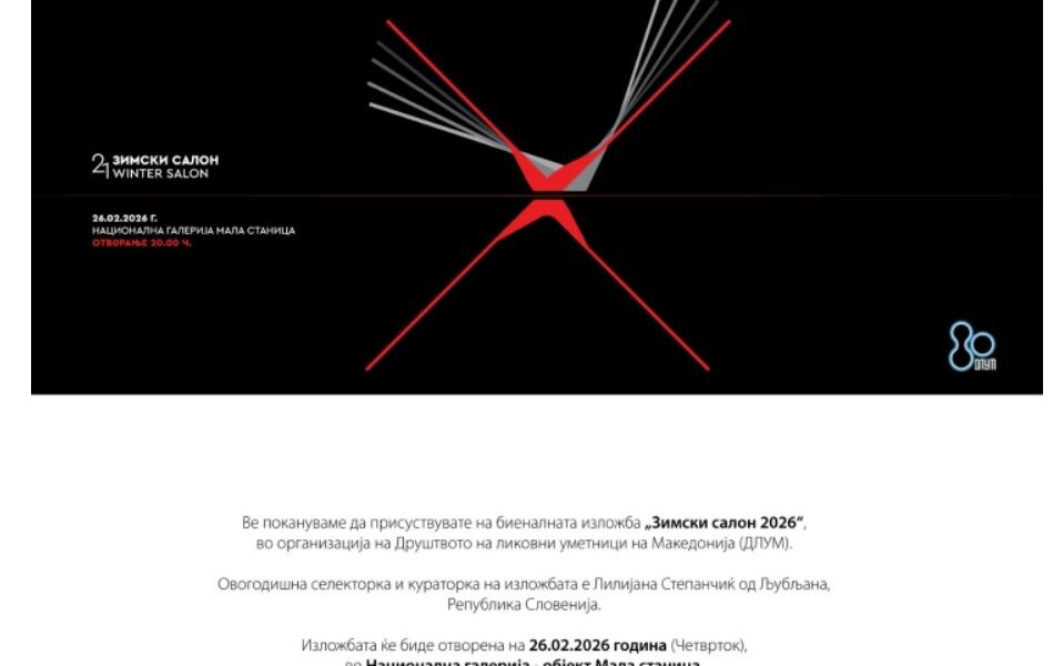 Зимски салон 2026“, изложба во организација на Друштвото на ликовни уметници на Македонија (ДЛУМ), вечер ќе биде отворена во Националната галерија, објект „Мала станица“. Изложбата е...