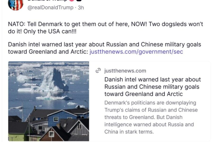 Американскиот претседател Доналд Трамп побара од Данска веднаш да се повлече од Гренланд. „НАТО, кажете ѝ на Данска веднаш да се губи оттаму! Две кучешки запреги...