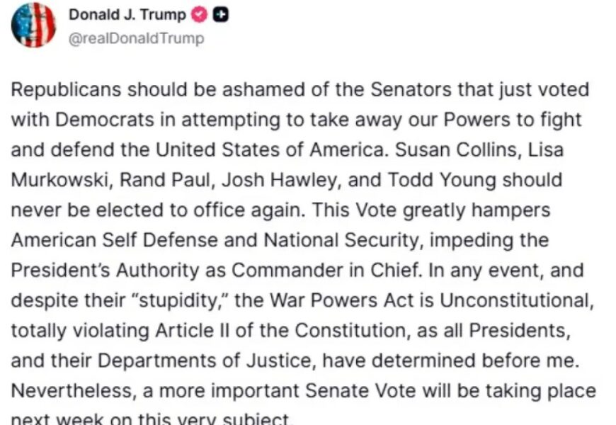Претседателот на САД Доналд Трамп ги осуди своите сопартијци од Републиканската партија во Сенатот, кои денеска гласаа во полза на резолуцијата за ограничување на неговите воени...