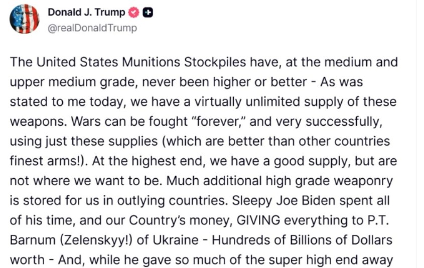 Американскиот претседател Доналд Трамп на својата платформа Truth Social напиша дека американските резерви на муниција се на историски максимум што аналитичарите го толкуваат како јасна порака...